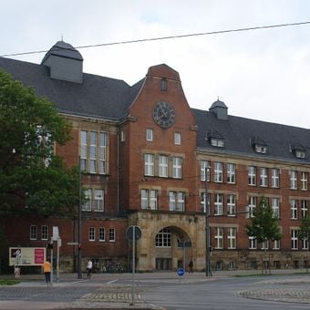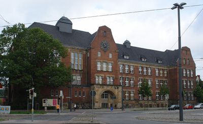 La Oberschule am Leibnizplatz presenta una combinazione di elementi architettonici gotici e liberty, con facciate in mattoni rossi e decorazioni in pietra.