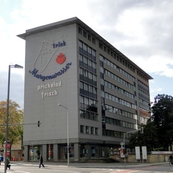 L'edificio mostra una pubblicità illuminata con un bicchiere d'acqua frizzante con lo slogan 'Prickelnd frisch' per Margonwasser, un'acqua minerale regionale.