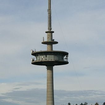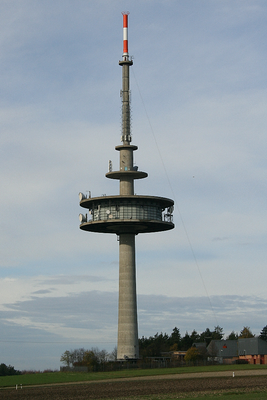 La torre in cemento raggiunge un'altezza di 127.4 metri e si trova a un'elevazione di 558 metri sulla collina di Wachknock.