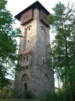 La torre dell'acqua si erge dalla collina Burgberg, presentando elementi strutturali che riflettono i metodi ingegneristici tedeschi del periodo industriale.