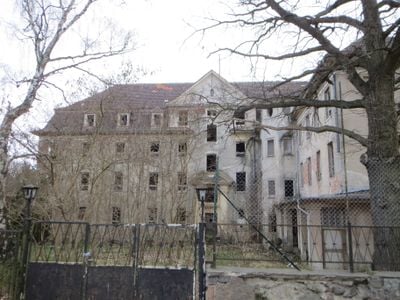 Le strutture deteriorate rimangono vuote sul Glienberg vicino al centro di Zinnowitz, con potenziali piani di conversione in unità residenziali annunciati nel 2024.