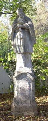 Nepomuk-Statue, heiliger Johannes von Nepomuk, neubarock, wohl um 1900; am Eingang des neuen Friedhofs von Untermenzing, siehe Eversbuschstraße 9a