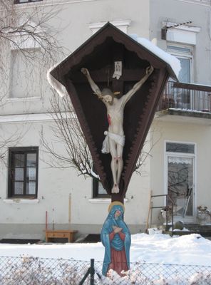 Wegkruzifix, hölzernes und bemaltes Christus-Corpus, wohl 18. Jh., mit bemalter Bildtafel der Maria, Ende 19. Jh