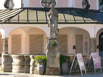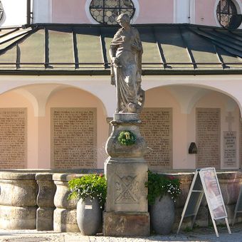 Marktbrunnen, geschwungenes Brunnenbecken mit zentraler Figur der Hl. Katharina, 1923 von Friedrich Lommel