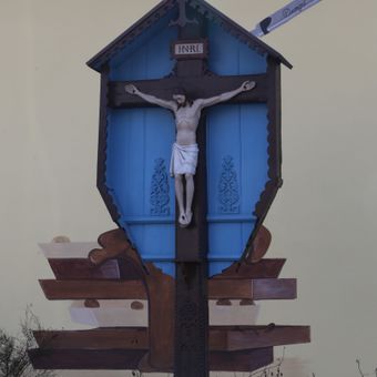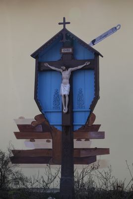 Wegkreuz, geschnitzter Corpus in ornamentiertem Wettermantel, am Kreuzschaft bezeichnet mit dem Jahr 1852