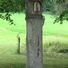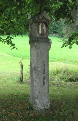 Bildstock, tuffpfeiler mit Marienmedaillon und schmiedeeisernem päpstlichem Kreuz, 18. Jahrhundert, am westlichen Ortsrand