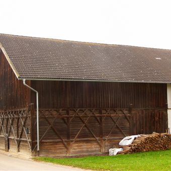 Stadel, satteldachbau in Holzkonstruktion, an Süd- und Ostseite Ständerbohlenkonstruktion mit Bundwerk, bezeichnet 1857