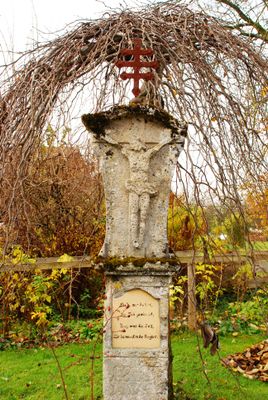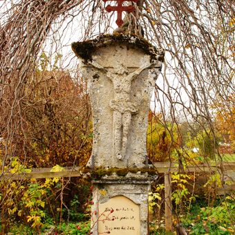 Bildstock, tuffpfeiler, wohl noch 18. Jahrhundert, mit Kruzifix, bezeichnet 1835