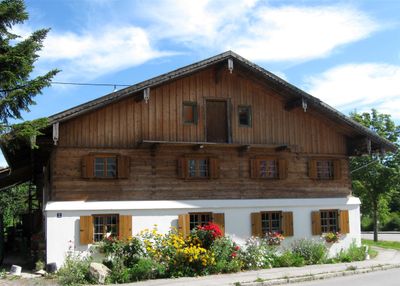 Ehemaliger Bauernhof, zweigeschossiger Einfirsthof mit flachem Satteldach, verbretterter Hochlaube und Blockbau-Obergeschoss, bez. 1804