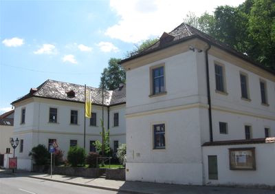 Untermarkt 65-67, Wolfratshausen, ehemaliges Landgerichtsgefängnis, dann Amtsgericht, zweigeschossiger putzgegliederter Dreiflügelbau mit Walmdächern, 1816