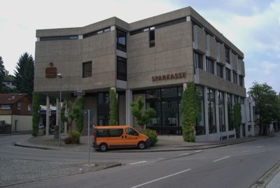 Stadtsparkasse, dreigeschossiger Stahlbetonskelettbau mit Flachdach, Lochfassade mit vorgehängten, steinmetzmäßig bearbeiteten Betonplatten, bildet den Innhaus-Typus in Formen der klassischen Moderne nach, 1963–1967 von Alexander von Branca