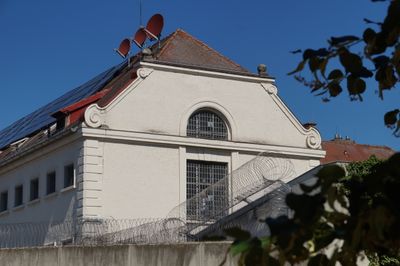 Justizvollzugsanstalt, dreigeschossiger Krüppelwalmdachbau auf H-förmigem Grundriss mit zwei Höfen, Eingangsrisalit und Schweifgiebeln, Fassadengliederung mit Quaderungen, Neurenaissance, 1905 von Friedrich Niedermayer