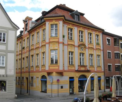 Westenstraße 1, ehemaliges Stadtrichtergebäude, später Stadtpropstei, an drei Seiten freistehender Mansardwalmdachbau mit Eckerkern und Stuckfassade mit antikisierenden Köpfen, von Gabriel de Gabrieli 1735, im Kern das schon im 17. Jahrhundert erwähnte Stadtrich