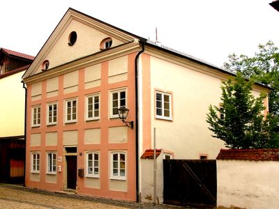 Former chaplain's house, zweigeschossiger Satteldachbau mit Putzbandgliederungen und kräftig profiliertem Dreiecksgiebel mit Rundfenstern, um 1755