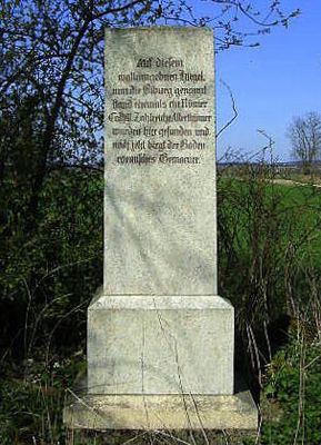 Kastell Pförring, Gedenkstein zur Erinnerung an das römische Castell Celeusum, Steinpfeiler auf Sockel, um 1860, in jüngerer Zeit ersetzt und erneuert; ca. 850 m südlich in der Flur Biburg