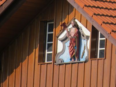 Auferstehungschristus, holzfigur, wohl 16. Jahrhundert; im Giebel