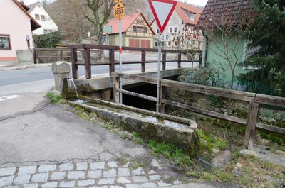 Brunnen, pfeiler mit kreuzdachförmigem Aufsatz und längsrechteckigem Tränkebecken, bezeichnet „1861“, Pfeiler und Tränkebecken erneuert
