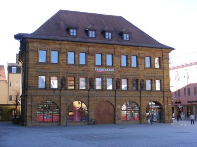 Marktplatz 3, dreigeschossiger Walmdachbau mit Ecklaube, Aufzugsgaube, Nischenfiguren der vier Elemente und Hausteingliederungen in Sandstein, ab 1726