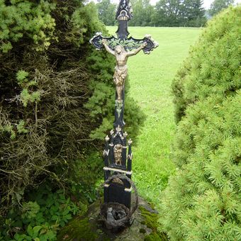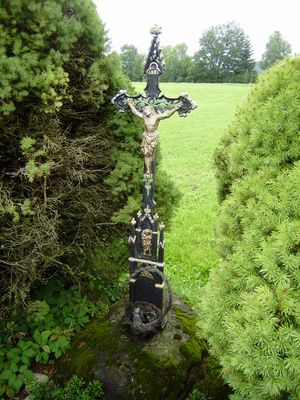 Gusseisenkruzifix Harratried in Röthenbach im Allgäu, gusseisenkruzifix auf ornamentiertem Sandsteinsockel, 1. Drittel 19. Jahrhundert