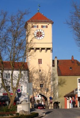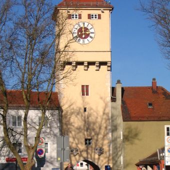 Donautor, mit Pyramidendach, breitgelagerter spitzbogiger Durchlass, zweite Hälfte 13. Jahrhundert, stadtseitig bezeichnet „1493“, Dach von 1809, feldseitig von Konsolen getragener Balkon, 19. Jahrhundert