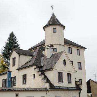 Fuggersches Gartenschloss, viergeschossiger, turmartiger Bau mit flachem Pyramidendach und polygonalem, erhöhtem Treppenturm, um 1600, um 1690 verändert, im 19. und 20. Jh. mehrfach erweitert