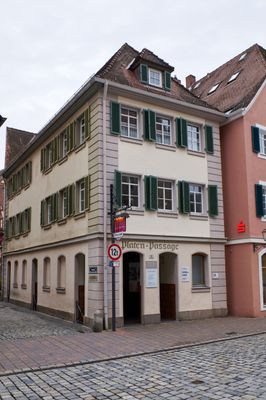 Platenstraße 2, dreigeschossiger Walmdachbau in Ecklage, mit rustizierten Ecklisenen, 18. Jahrhundert, mit anschließendem schmalem Wohnhaus, dreigeschossiger giebelständiger Satteldachbau, 17. Jahrhundert