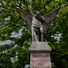 Kriegerdenkmal 1870/71, skulptur eines geflügelten Kriegers mit Schwert auf hohem Postament mit farbiger Inschrift, davor Löwenfigur auf niedrigerem Sockel mit Wappenkartusche, von runder Steinbank eingefasst, Stein, um 1907