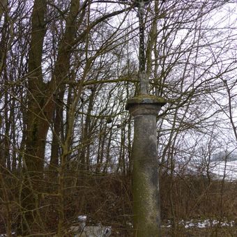 Wegkreuz, gusseisenkreuz mit Viernageltypus und Maria auf toskanischer Granitsäule, bezeichnet 1880