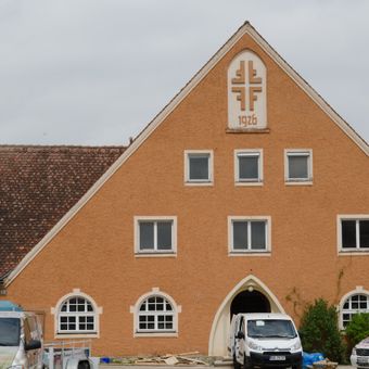 Gießbrücke 2 in Heidenheim in Mittelfranken, eingeschossiger Satteldachbau, mit Zwerchhaus, im Stil des Expressionismus, bezeichnet 1926