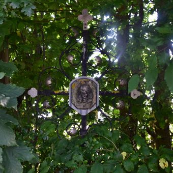 Wegkreuz, steinsockel mit griechischem Kreuz mit Dreipassenden und Voluten mit Blattenden, Schmiedeeisen, Korpus Gusseisen, 18./19. Jahrhundert
