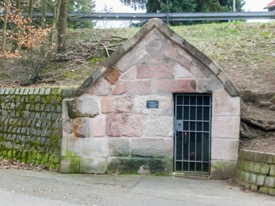Zur schmerzhaften Mutter, in den Hang gebauter Sandsteinquaderbau mit Giebel, Restbau der Kapelle zur Schmerzhaften Mutter, 1498