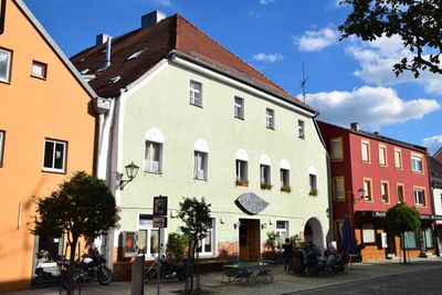 Ehemaliges Pflegamt, stattlicher zweigeschossiger und verputzter Halbwalmdachbau mit rundbogiger Durchfahrt und hofseitig gedecktem Holzgang mit Balustrade, 17. Jahrhundert, im Kern 14. Jahrhundert