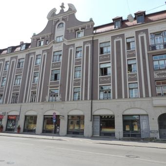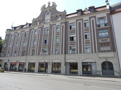 Ehemalige Jakobspfründe, jetzt Altersheim der Paritätischen St. Jakobsstiftung, viergeschossiger Mansarddachbau mit südöstlichem Runderker und flachem Mittelrisalit mit geschwungenem Giebel, neubarocker Erweiterungsbau, 1899, vgl. Mittlerer Lech 5