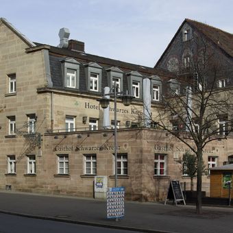 Gasthof Schwarzes Kreuz, zweigeschossiger giebelständiger Sandsteinquaderbau in Ecklage, mit Mansardgiebeldach, Volutengiebel und östlichem ein- und zweigeschossigem Anbau mit darüber befindlicher Terrasse, klassizistisch, im Kern 1768, Umbau und Erweiterung hin zur Köni