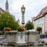 Herrnbrunnen, steinernes Becken mit Fischweibchen auf ornamentierter Brunnensäule, Bronzeplakette bezeichnet „1595“, Becken bezeichnet „1615“ und „1722“
