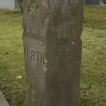 Grenzstein im Laubenweg, grenzmarkstein der alten Stadtmarkung Fürth bzw. der ehemaligen Gemeinde Ronhof, Sandstein, oben abgerundet, von Johann Zink, 1858, Renovierung bzw. Versetzung bez. 1938