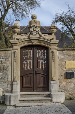 Schrannenplatz 3, bruchsteinmauerwerk mit reich verziertem Gartenportal mit vier Sonnenuhren und einer Globusuhr, 18. Jahrhundert