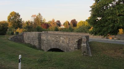 Turmseelein, Straßenbrücke, zweibogige Brücke aus staufischen Buckelquadern mit mittigem Turmunterbau und Reste der alten Zugbrückenauflagekonsolen, um 1400