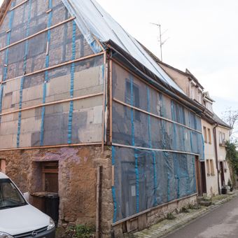 Krebengäßchen 6, 8, zweigeschossiger Traufseitbau mit steilem Satteldach und verputztem Fachwerk-Obergeschoss sowie -Giebel, dendrochronologisch datiert um 1425