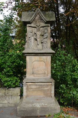 Rotenhansche Marter, breiter Sockel (erneuert), Aufsatz mit Kreuzigungsrelief und Heiligendarstellungen an den Schmalseiten, Sandstein, gotisch, 1501
