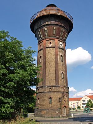 Wasserturm Hoyerswerda, Bahnwasserturm mit Kugelbehälter der Bauart Klönne, eisenbahngeschichtlich sowie technikgeschichtlich von Bedeutung; ca. 30 Meter hoher Klinkerbau mit Lisene]]n und Ziersimsen, aufgesetzter Wasserbehälter der [[Wasserturm mit ca. 300 Kubikmetern F