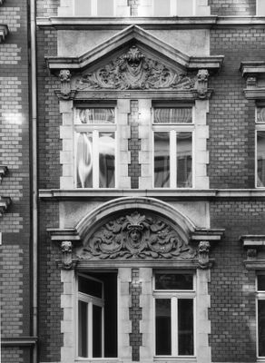 Mietshaus Mariannenstraße 78, Mietshaus in geschlossener Bebauung; Klinkerfassade, Stuckrahmen im Eingangsbereich