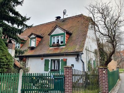 Häuslergasse 8, Wohnhaus in Leipzig-Paunsdorf; offene Bebauung mit Vorgarten und Einfriedung; Lehm- und Ziegelbau mit Putzfassade, baugeschichtlich sowie wissenschaftlich-dokumentarisch von Bedeutung