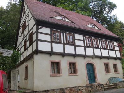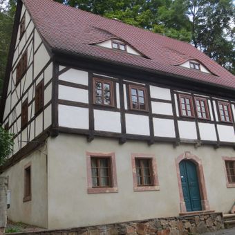 Schloßberg 8 Chemnitz, Wohnbau ländlichen Charakters in beherrschender Lage am Aufgang zum Schloßberg, im Obergeschoss erhaltene Fachwerkkonstruktion mit Verblattungen und Kopfstreben heute freigelegt