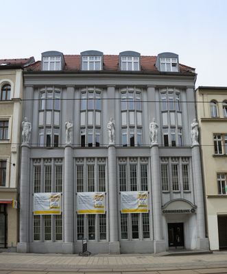 Commerzbank; Löbauer Bank in geschlossener Bebauung Berliner Straße 53, Pläne vom Görlitzer Baumeister Franz Grunert, im zweiten Obergeschoss an der Fassade fünf vollplastische Figuren, gebaut als Löbauer Bank, in 1920er Jahren in der Commerz- und Privatbank AG Hamburg-Berlin aufgegangen, architekturgeschichtlich, ba