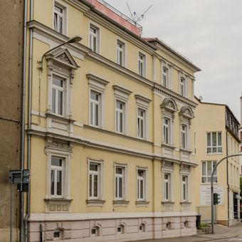 Zwingerstraße 14, baugeschichtlich von Bedeutung, weitgehend originaler Putzbau, gründerzeitliche Putzgliederung, dreigeschossig