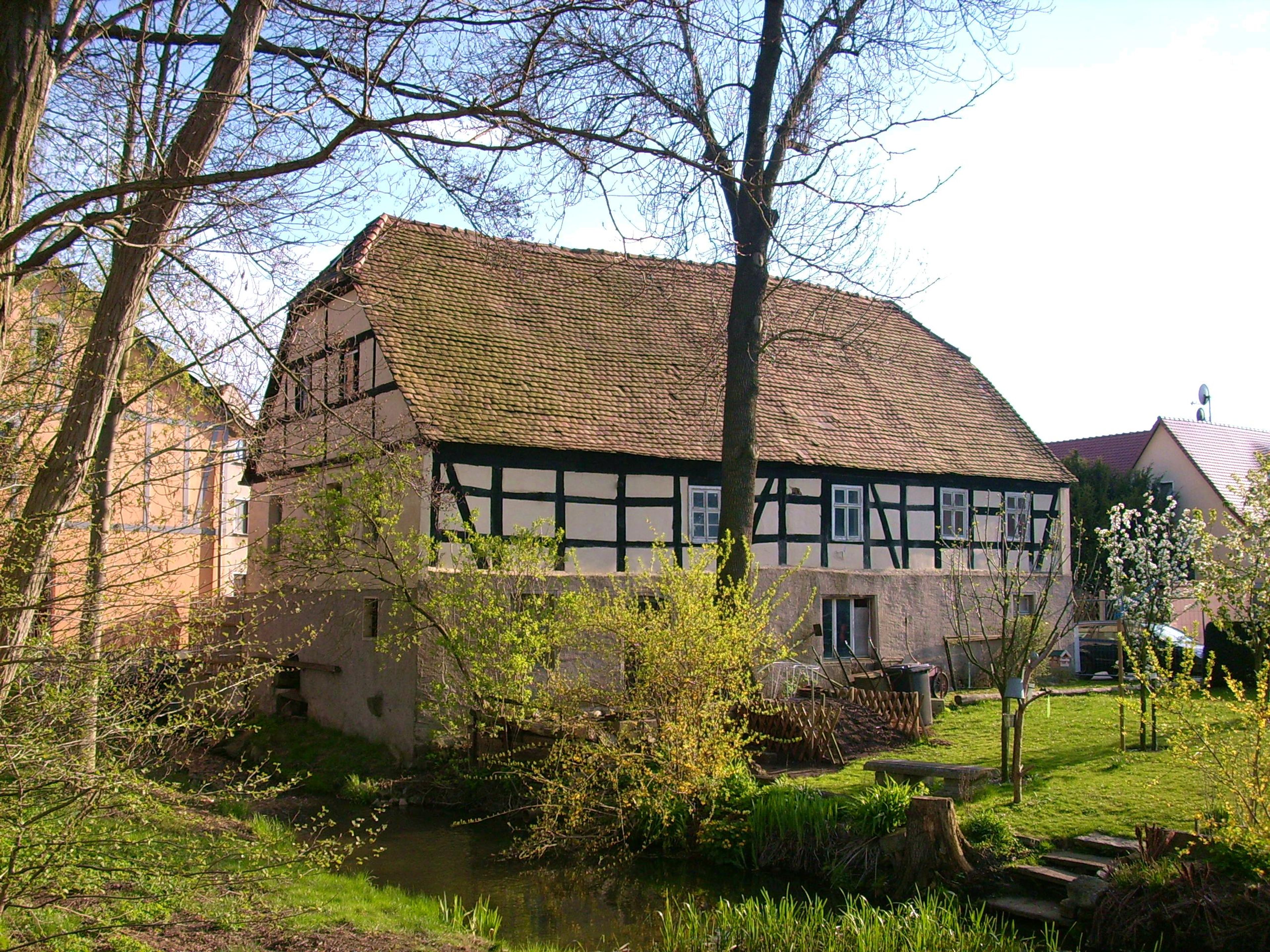 Stadtmühle Wittichenau, Stattlicher Baukörper, Obergeschoss Sichtfachwerk, baugeschichtlich und ortsgeschichtlich von Bedeutung. Mühle: Erdgeschoss massiv, am Mühlgraben die Achse des Mühlrades noch erkennbar, Obergeschoss mit zweiriegeligem Fachwerk mit kräftigen Balk