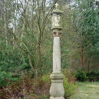 Bildstock Rosenthal, Bauchiger Sockel, darüber toskanischer Säulenschaft, Aufsatz mit vier Heiligenreliefs, regionalgeschichtlich von Bedeutung