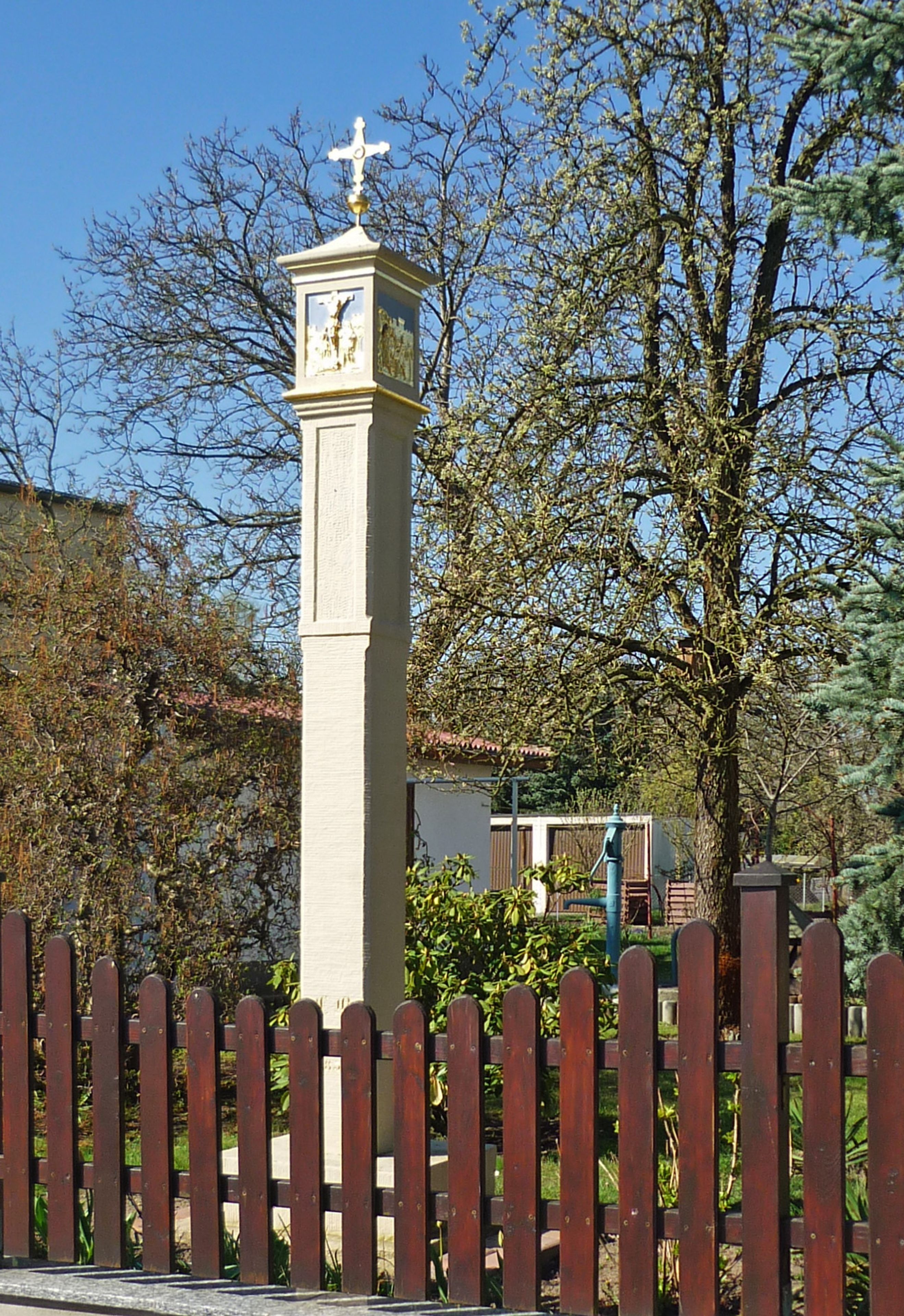 Bildstock August-Bebel-Straße 6, Orts- und religionsgeschichtliche Bedeutung, hohe Granitstele mit vier Reliefs mit Passionsszenen: Kreuzigung, Grablegung, Himmelfahrt, Auferstehung, Inschrift: „U. B. / D. B. / 1854“, „Rest. A. u. T. B. 1992“