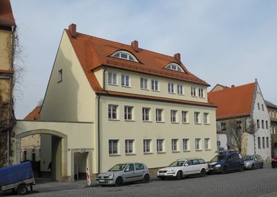 Wohnhaus in offener Bebauung, Hinterhaus , Scheune und seitliche Hofmauer mit Torbogen und Pforte Am Markt 16; 16a, house in Dohna, Germany